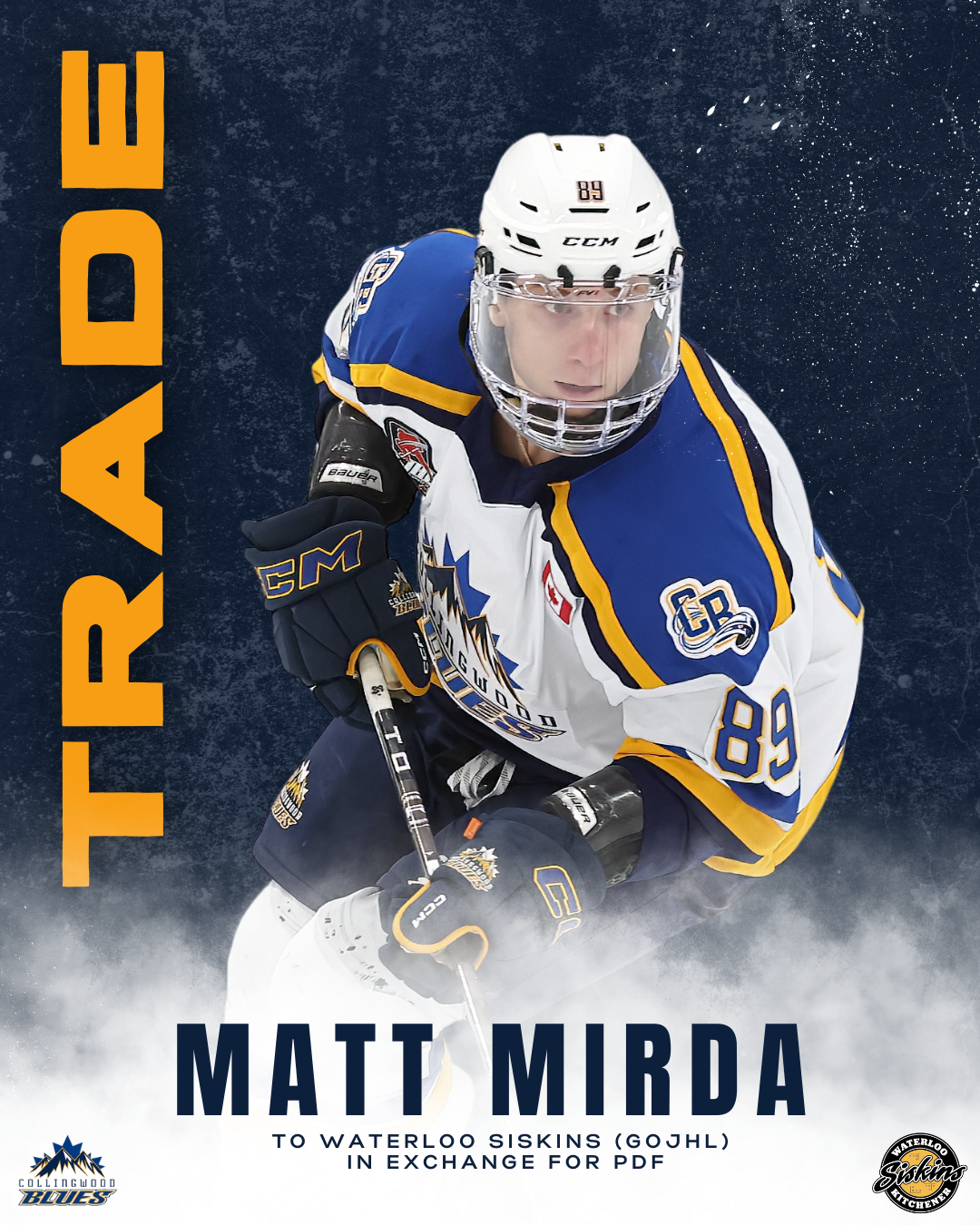 The Collingwood Blues have traded Matt Mirda to the Waterloo Siskins (GOJHL) in exchange for PDF.