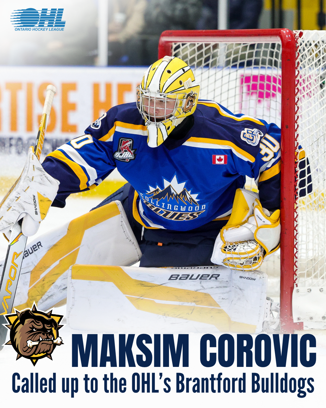 Collingwood Blues Goaltender #30 Maksim Corovic Called Up to OHL’s Brantford Bulldogs