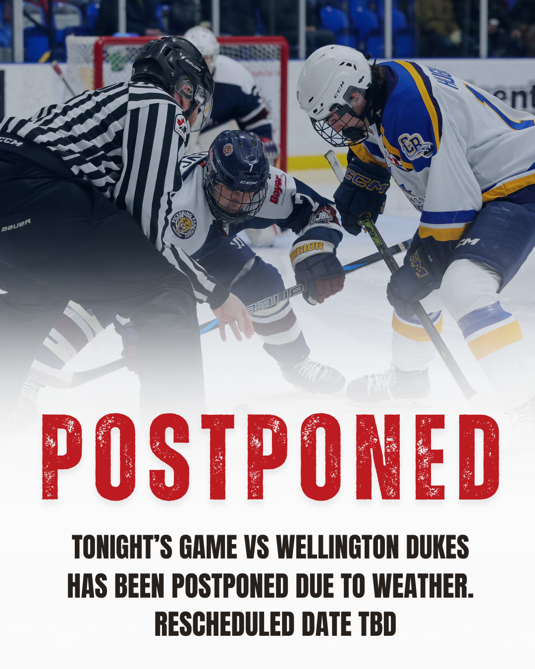 🚨 GAME POSTPONED 🚨 Tonight’s game vs. the Wellington Dukes has been postponed due to inclement weather. A new date will be announced soon — stay tuned for updates. Tickets purchased for tonight’s game will be valid for new scheduled date and time. 📷 OJHL Images #CollingwoodsTeam #PoweredByNutrafarms #drivenbymikejacksonGM