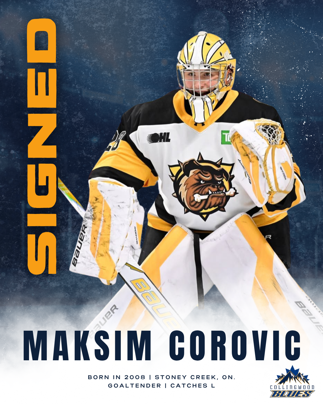 The Collingwood Blues have signed 2008-born goaltender Maksim Corovic from the Brantford Bulldogs (OHL).